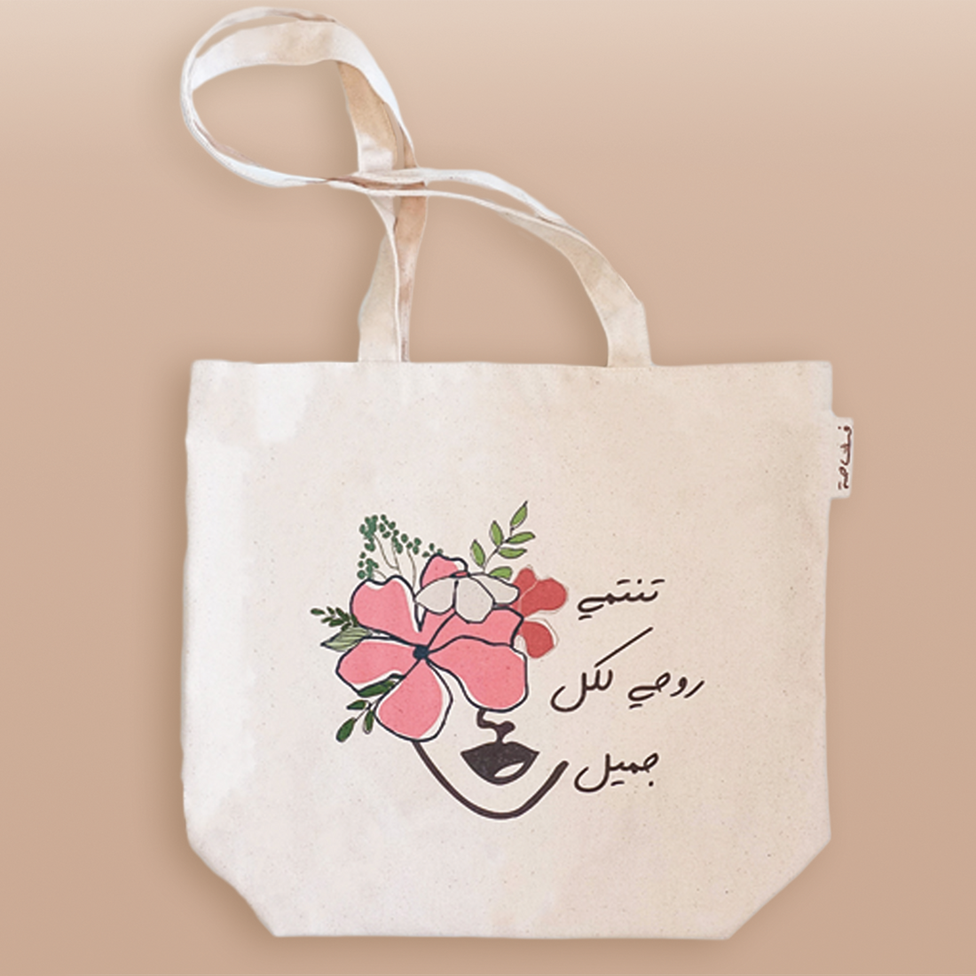 عن التصميم  ”تنتمي روحي لكل جميل"  صُممت للمتأمّلين، الذين يرون الجمال في كل شيء.    المواصفات   اللون: البيج الطبيعي  الحجم: ٤٠ x ٣٥ سم  نوع القماش: الكانفاس القطني    المميزات   جيب داخلي  صديقة للبيئة  مناسبة للاستعمال اليومي والدوام الرسمي ...