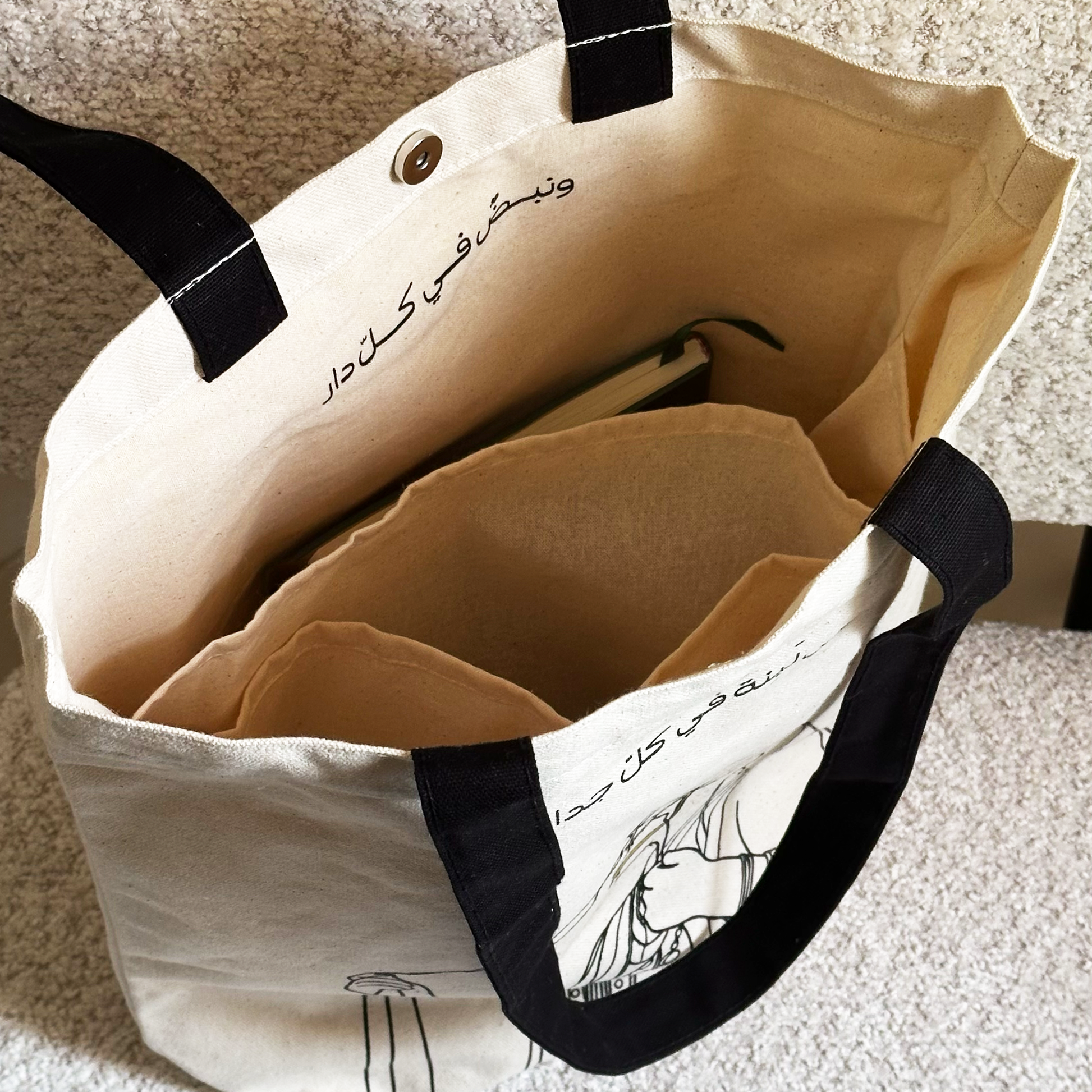- مصنوعة من قماش الكانفاس الطبيعي بلون بيج حيادي، مع مقبض أسود أنيق يناسب جميع الإطلالات