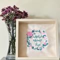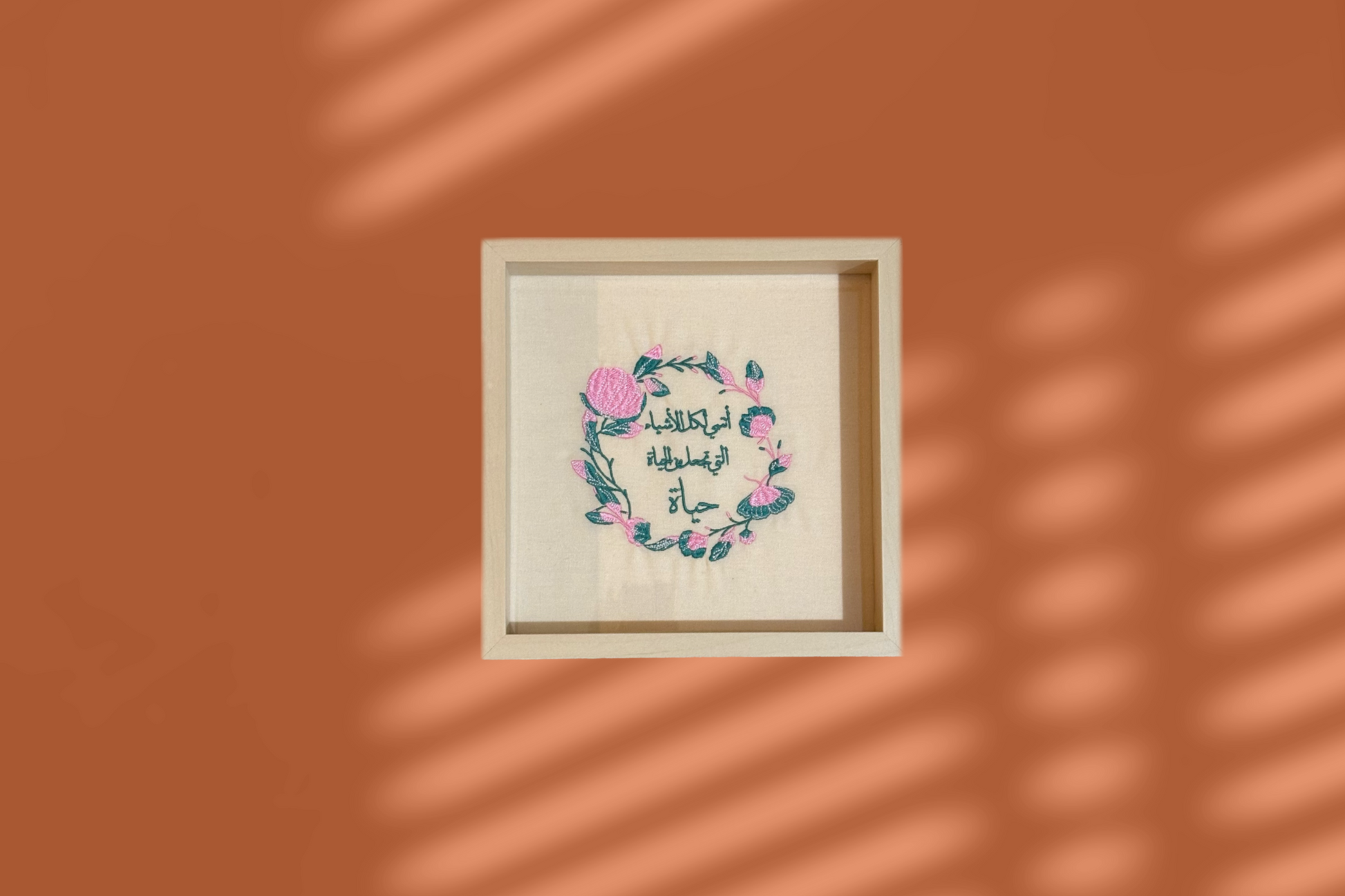 عمل فني مطرّز يدوياً على قماش قطني طبيعي بخط عربي أنيق. تُقدَّم بإطار خشبي بسيط أو بدون إطار حسب اختيارك. تضيف رونق لأي مساحة هادئة في البيت أو المكتب.