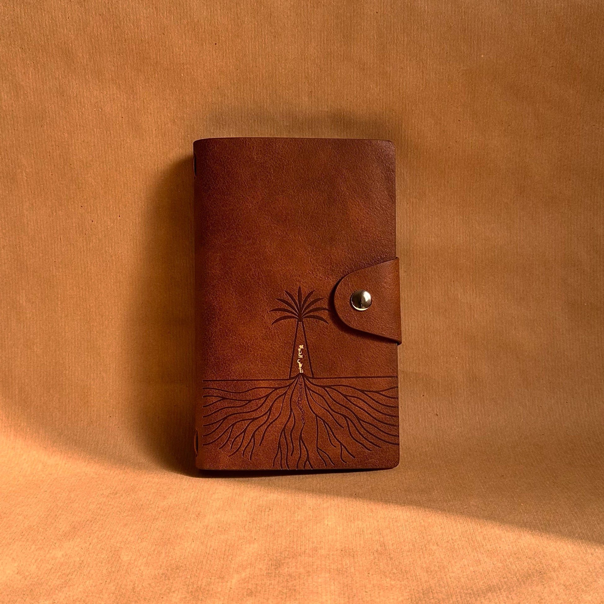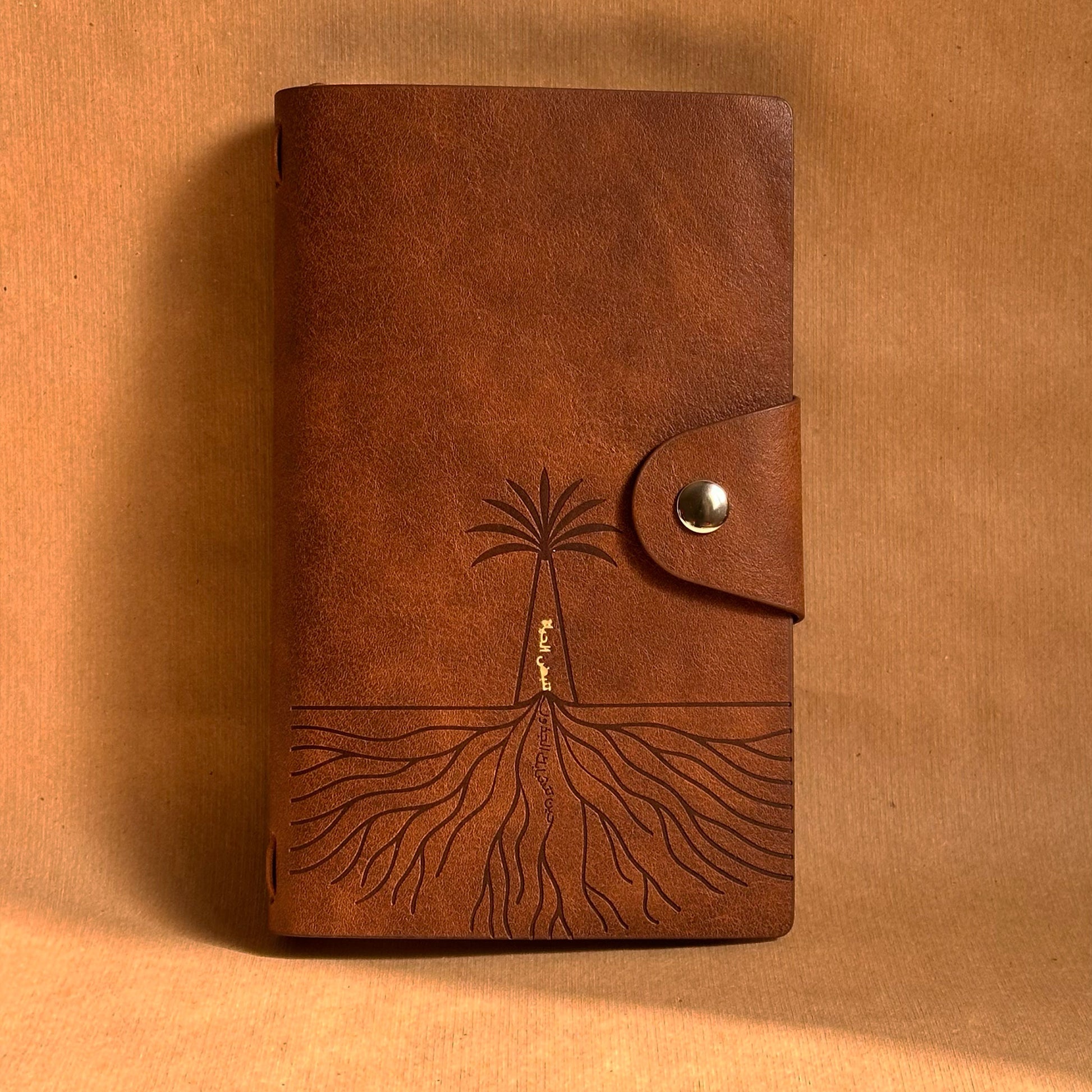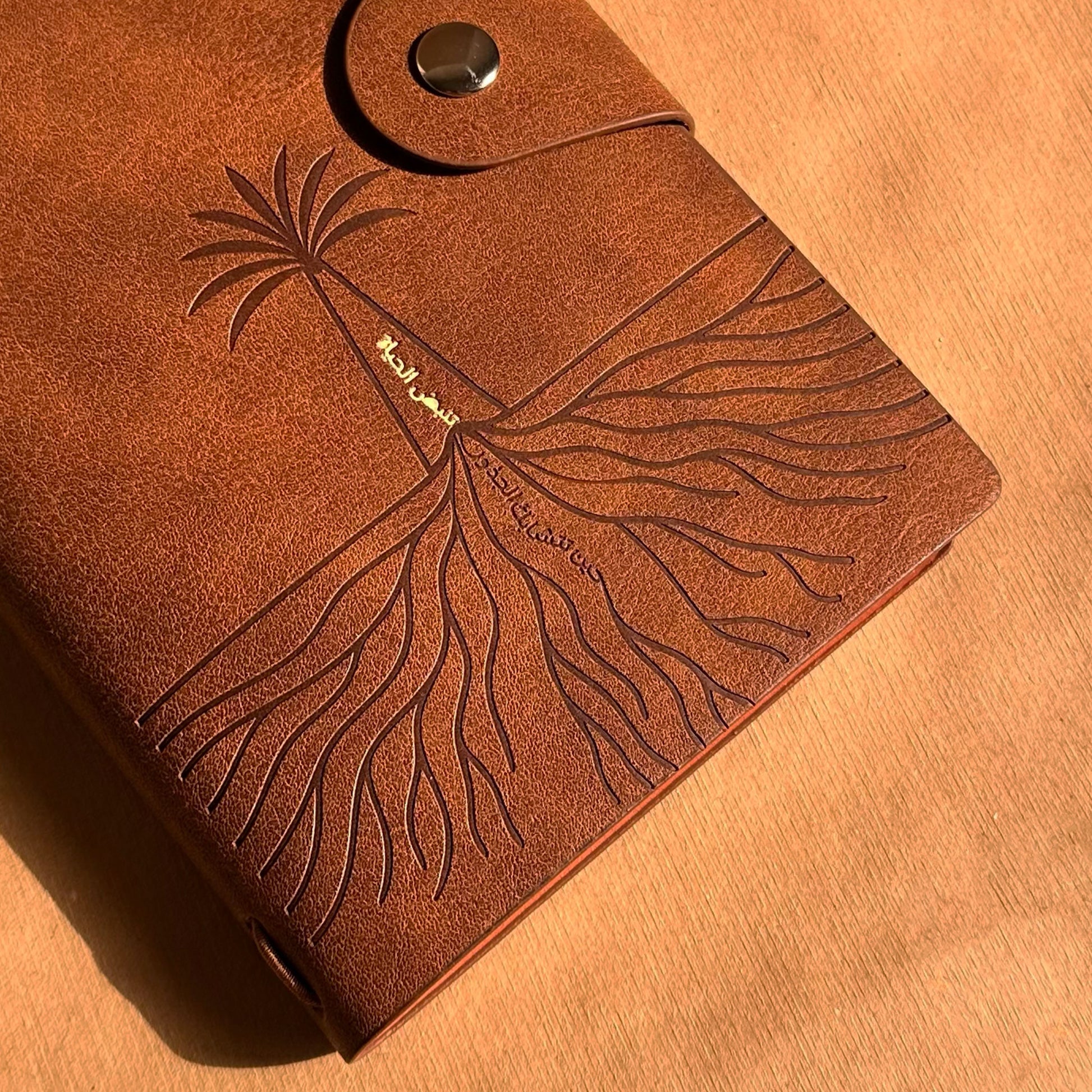 غلافه المصنوع من الجلد الناعم يحمل تصميم النخلة وجذورها بختم ذهبي محفور بعناية، مع العبارة «حين تتشابك الجذور، تنبض الحياة» تعبيراً عن روح عام المجتمع.